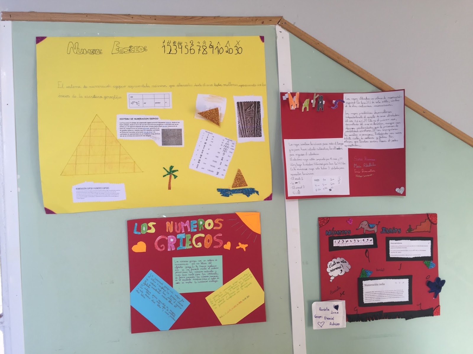 Cada alumno buscó en casa sistemas de numeración diferentes al nuestro. En clase, cada grupo eligió un sistema y comenzó a buscar información en diferentes dispositivos tecnológicos. De forma individual, en casa, terminaron de buscar la información y continuaron trabajando en clase con ella. Ayer comenzaron la presentación escrita, hoy la han terminado y han expuesto sus trabajos a los compañeros.